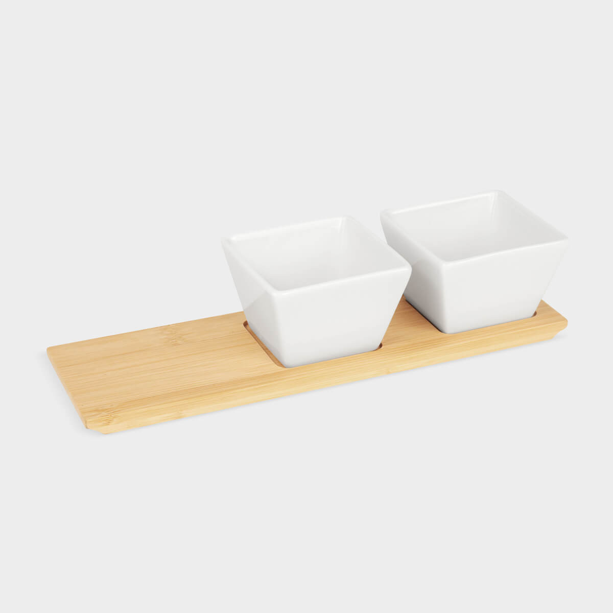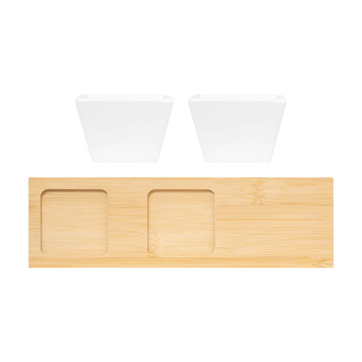 Botanero con base de bambú y dos contenedores de cerámica. Perfectos para servir botanas, dips o salsas con estilo. Ideal para reuniones, cenas o cualquier ocasión donde el diseño y la practicidad se encuentren. Incluye caja individual. El bambú es un producto natural el cual puede presentar variaciones en tonalidades y vetas.