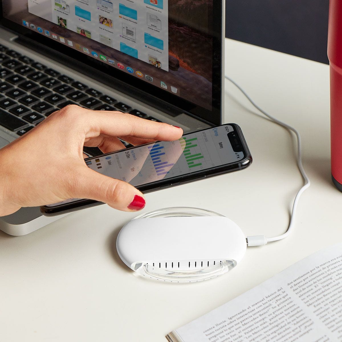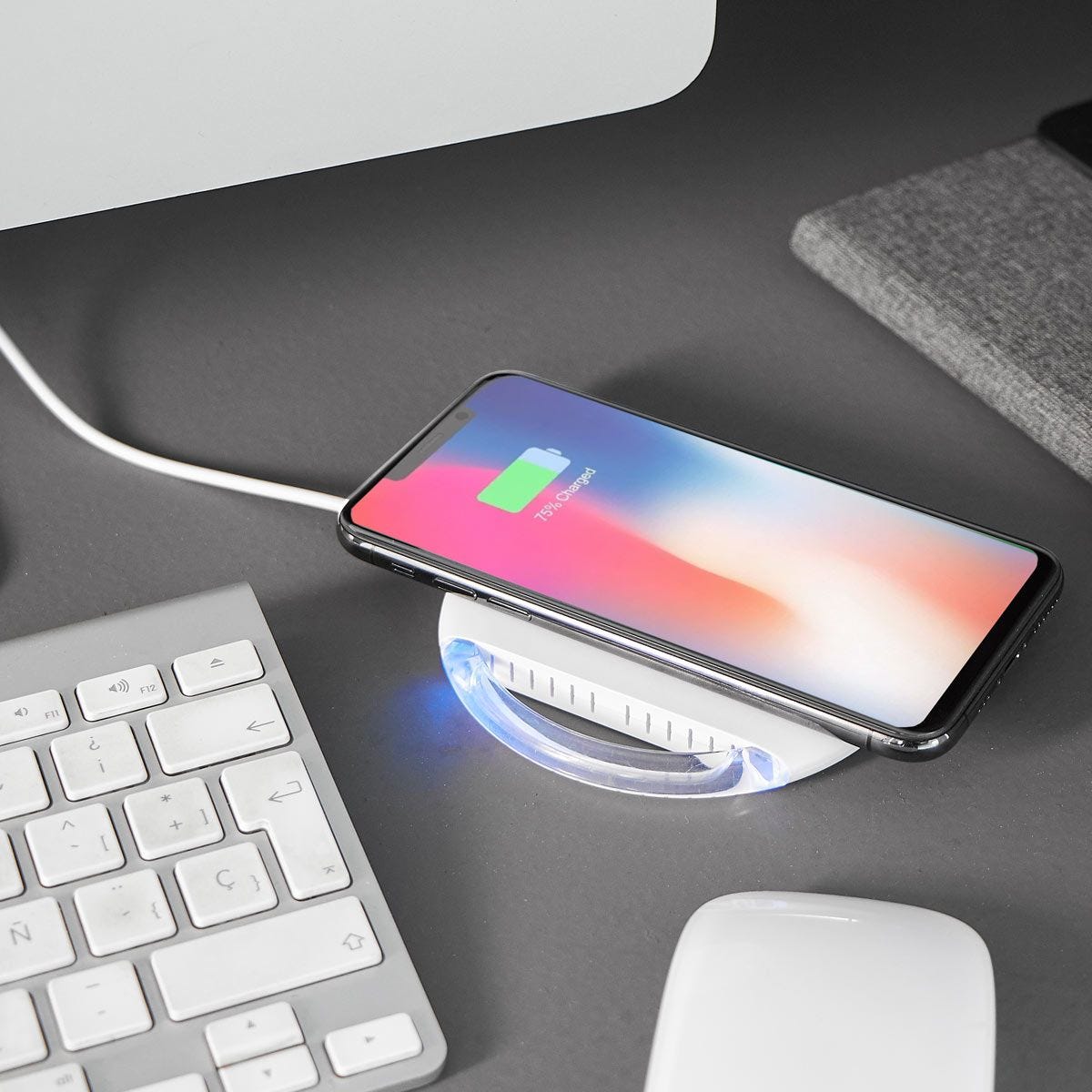 Cargador inalámbrico de escritorio para smartphone. Incluye cable cargador. Compatible con la mayoría de dispositivos comerciales que cuenten con tecnología de carga inalámbrica.
