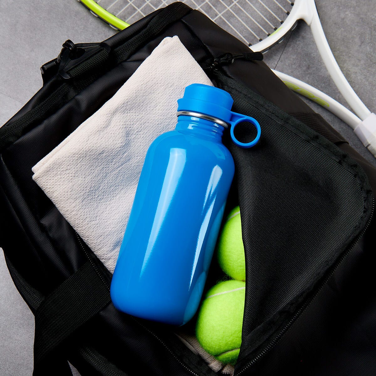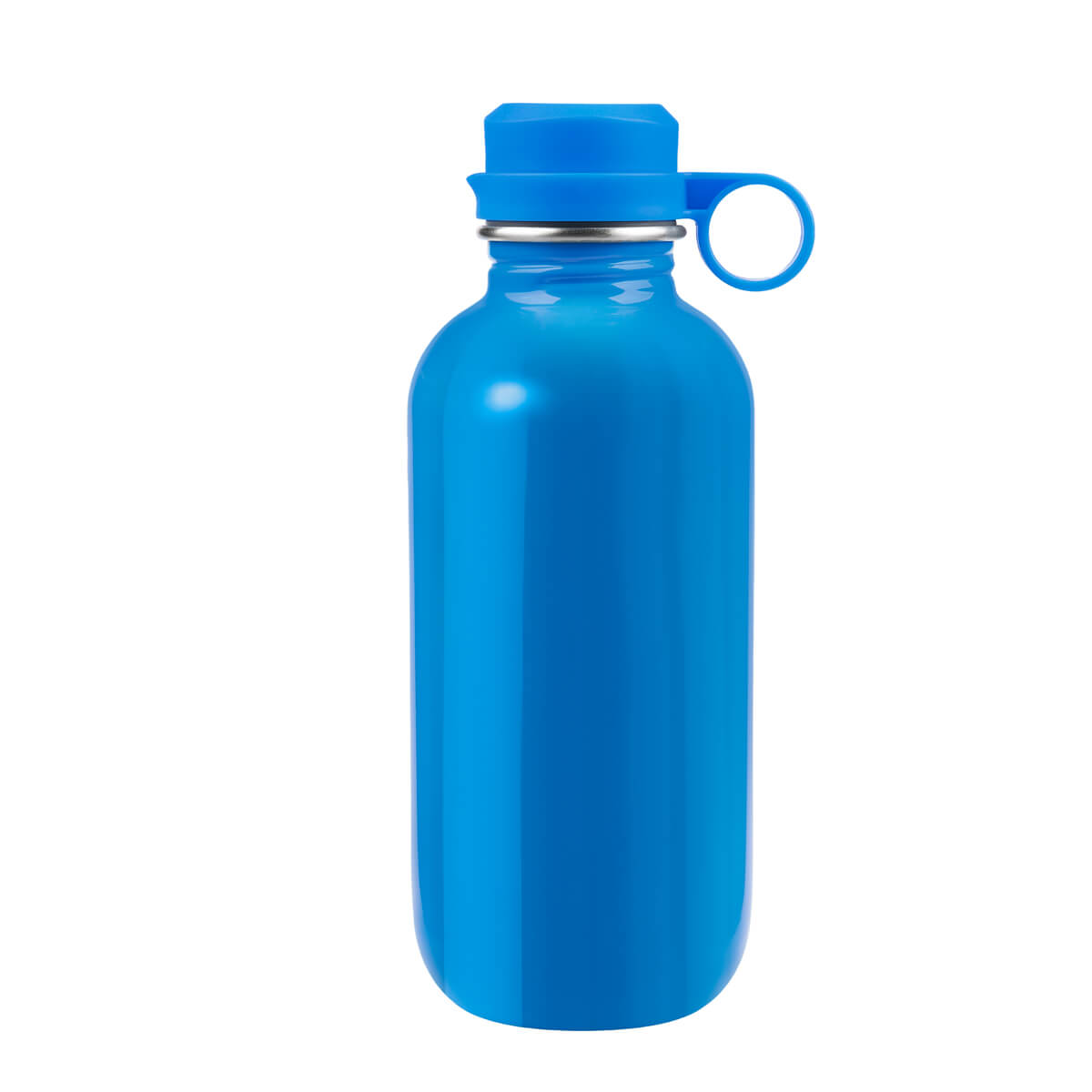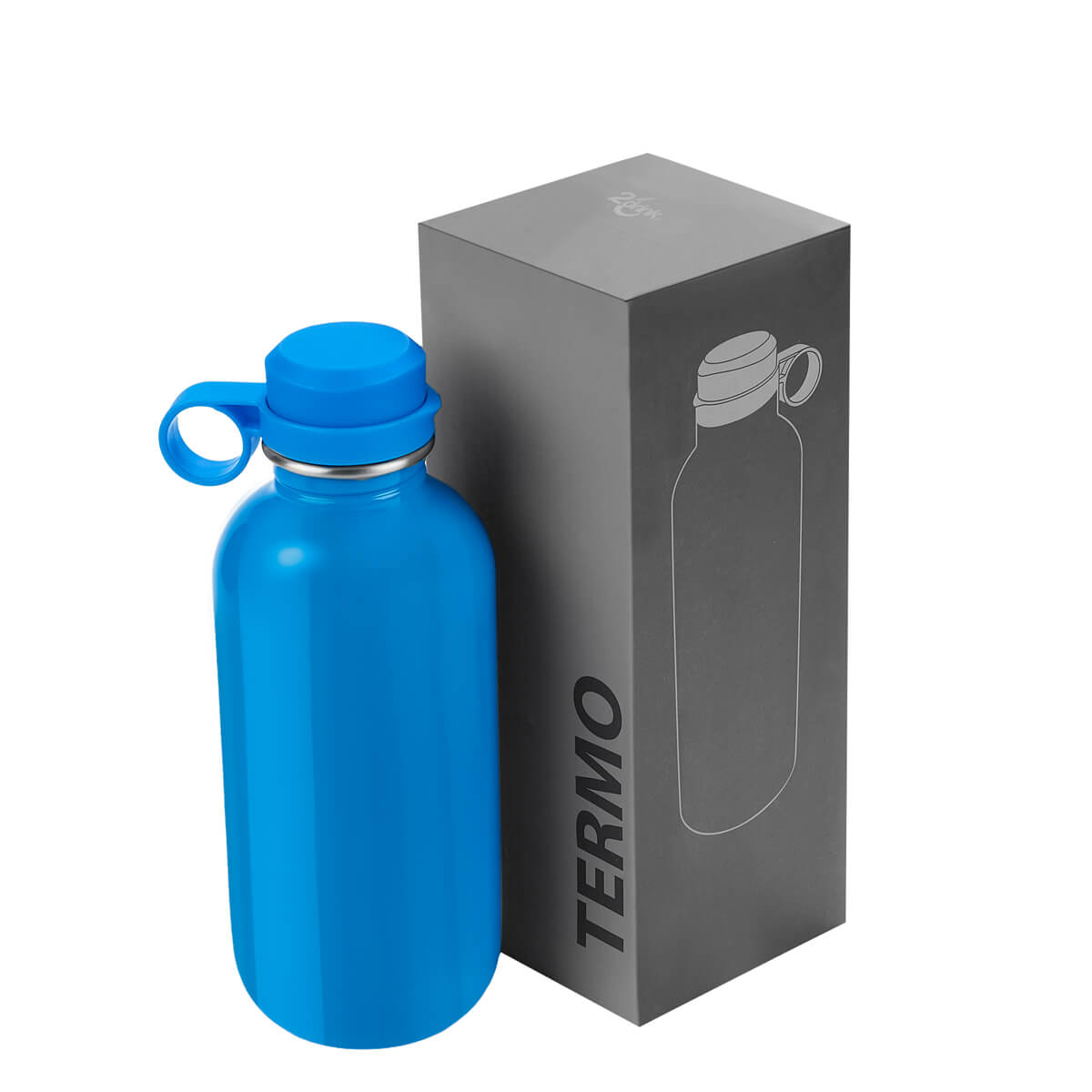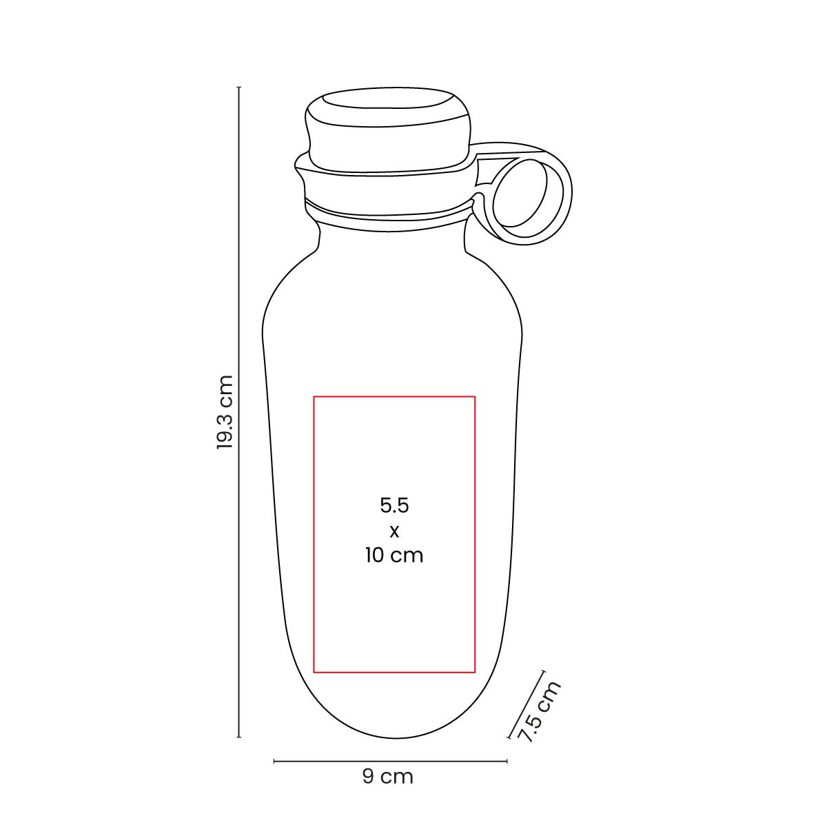 Cilindro metálico de una pared. Incluye tapa de plástico con sistema de rosca para un cierre hermético. Adicional, su misma tapa incluye una segunda rosca que incorporar un filtro para preparar té o infusiones. El asa en la tapa permite transportarlo con mayor comodidad. Capacidad de 22 Oz. Incluye caja individual.