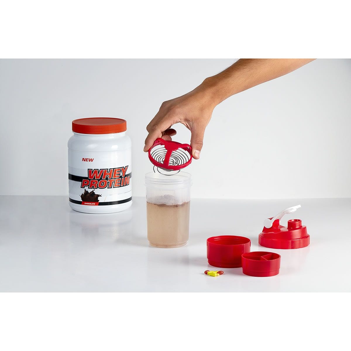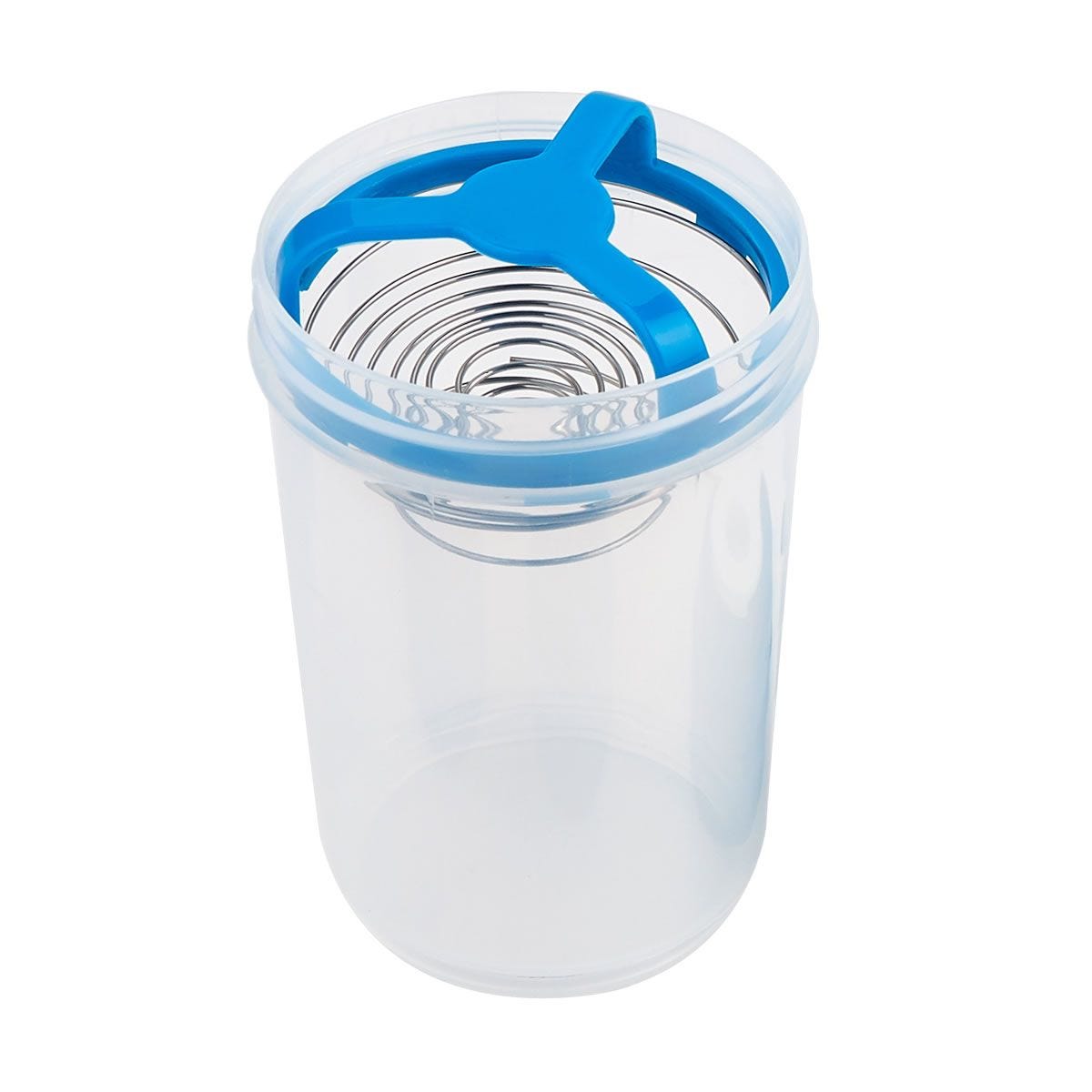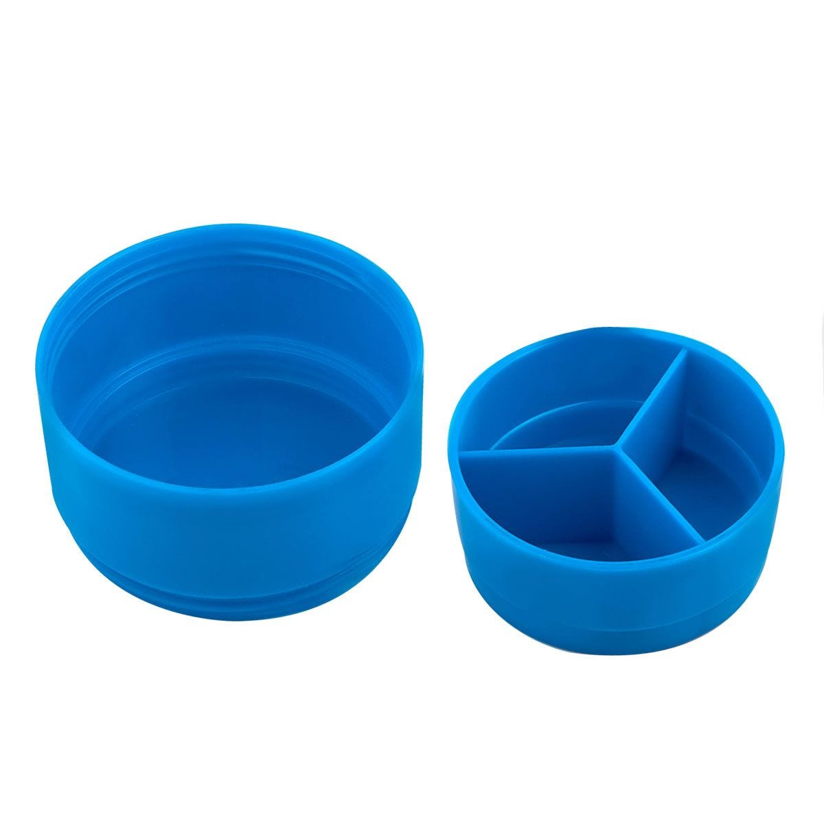 Incluye agitador. Cuenta con dos compartimentos especiales en la parte inferior y divisor de pastillas.