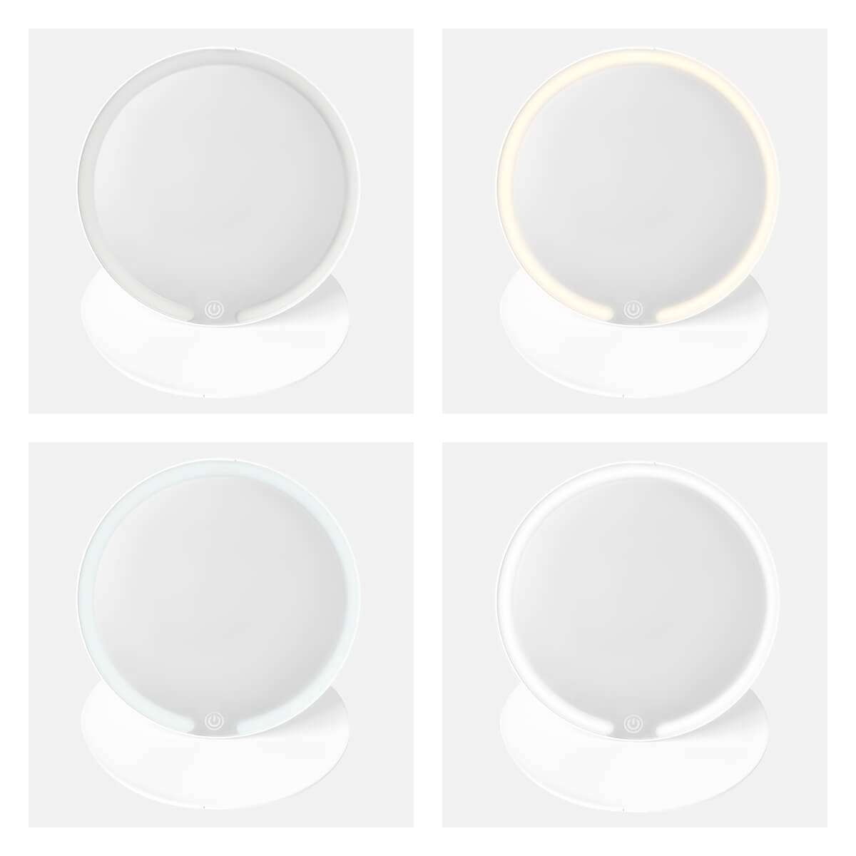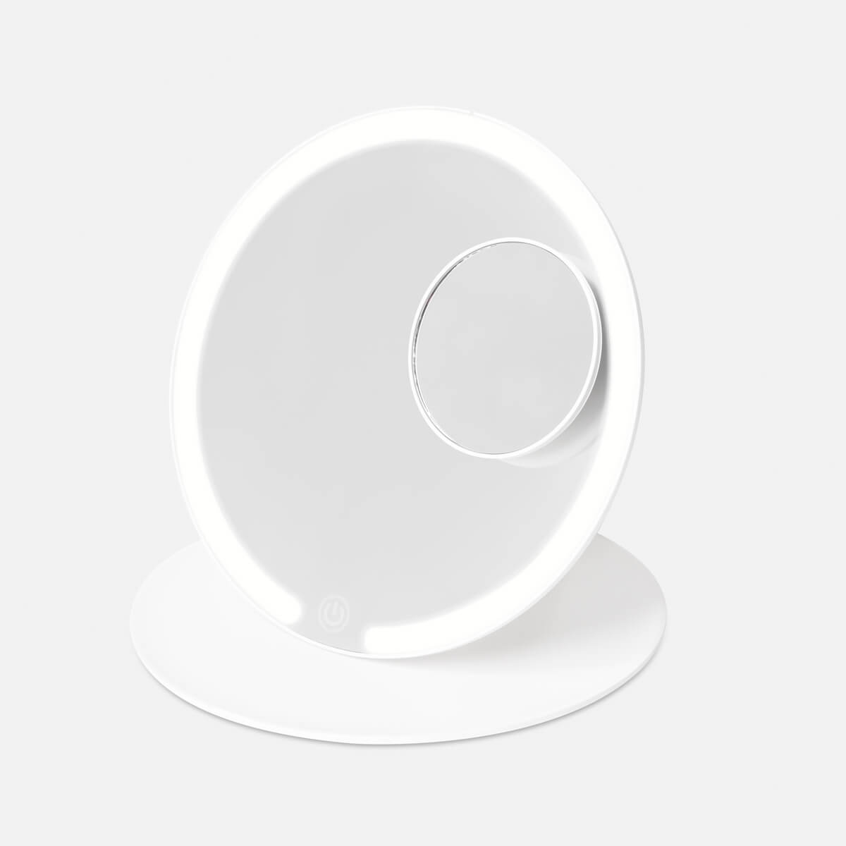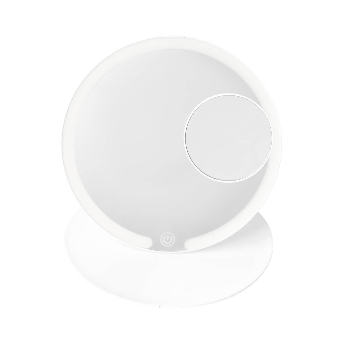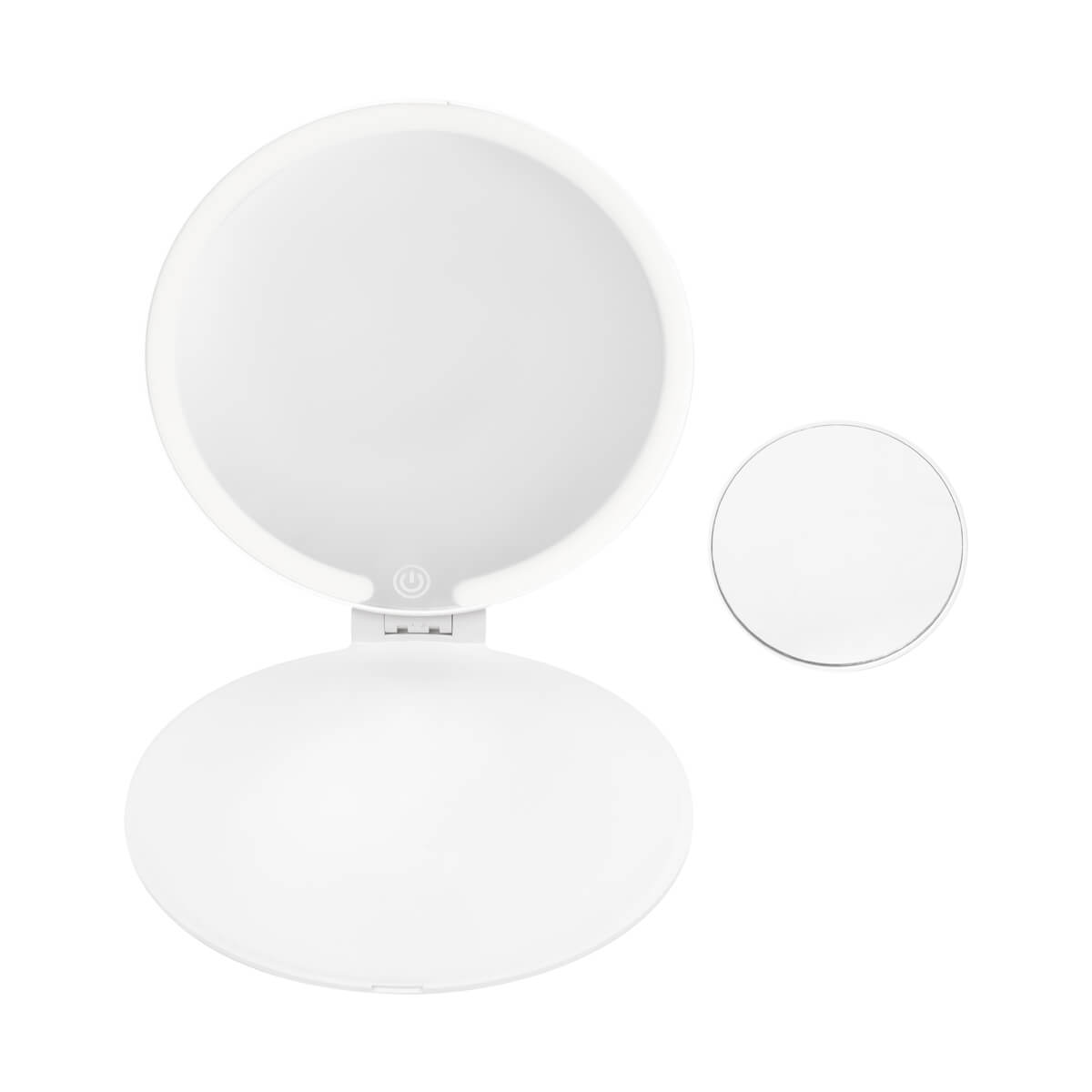 Espejo plegable con iluminación LED con 3 modos de luz: fría, natural y cálida. Pulsando el botón del sensor táctil one touch. Duración de luz de 3.5 hrs. Incluye espejo magnético de aumento 5x, puerto de carga y cable tipo C.