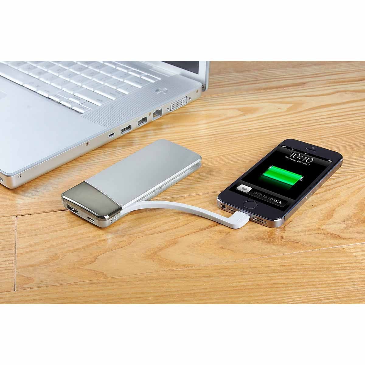 Batería auxiliar para smartphone, capacidad 4,000 mAh. Incluye cable cargador compatible con USB, 8 pin y micro USB. Cuenta con indicador de batería.