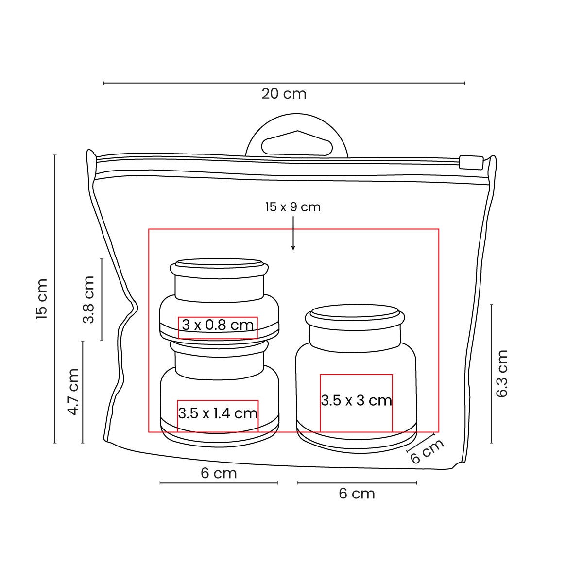 Set de contenedores de plástico para viaje. Ideales para almacenar productos de cuidado básico. Incluye bolsa con cierre zip.