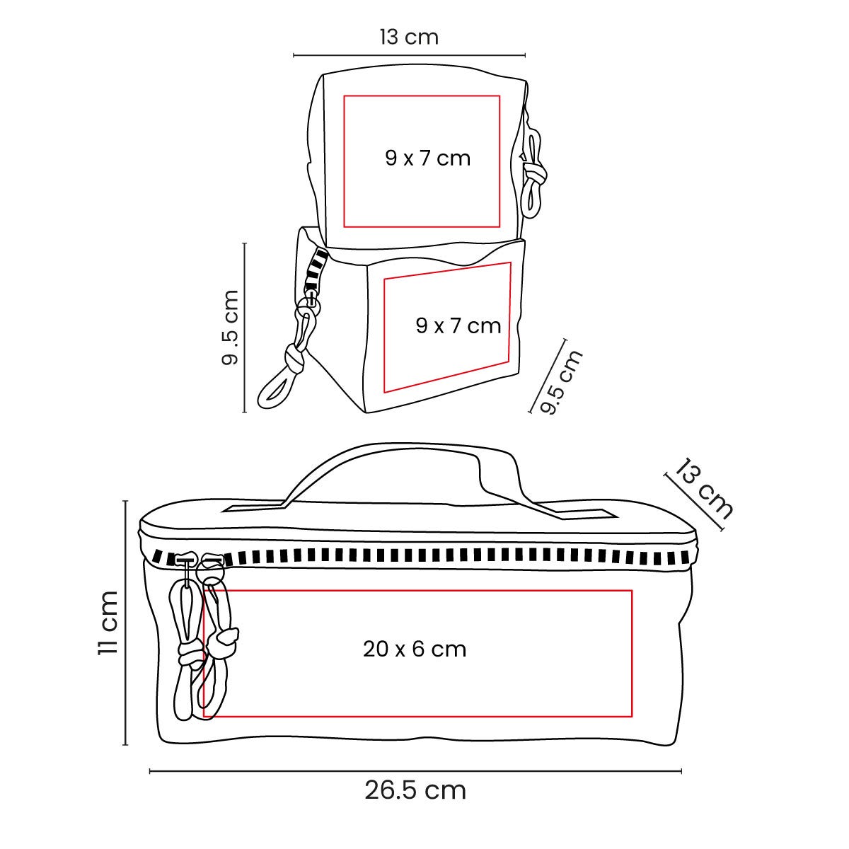 Área: 20 x 6 cm Estuche / 9 x 7 cm Neceseres