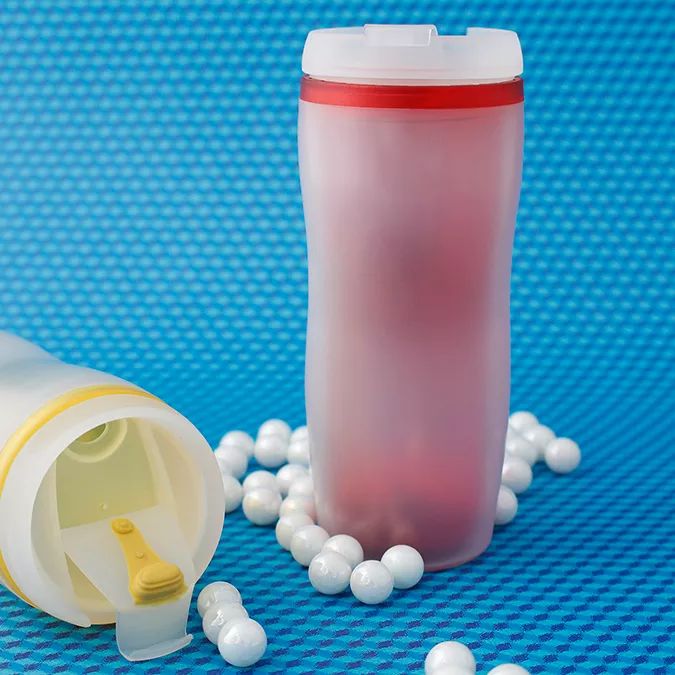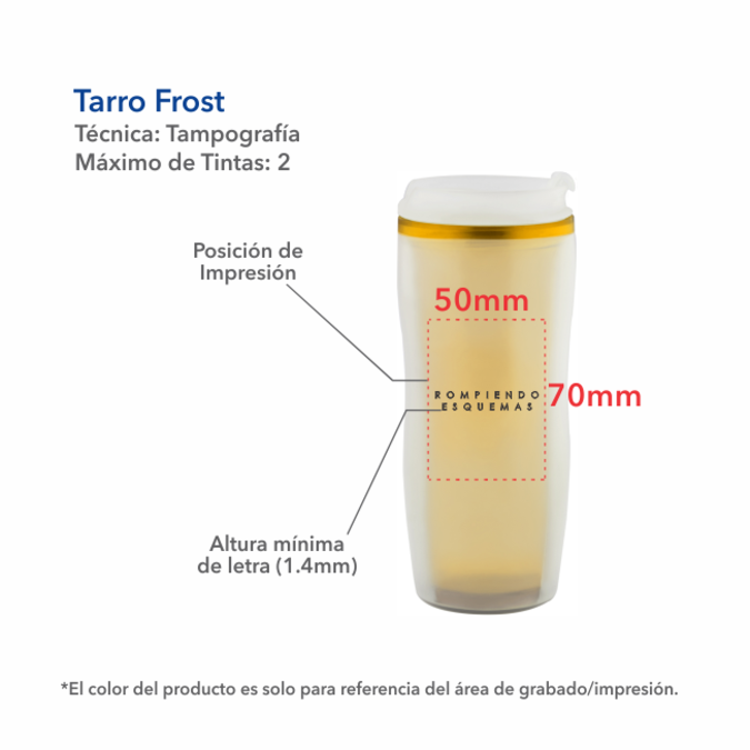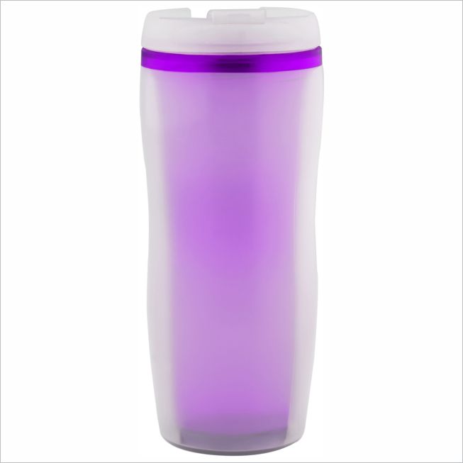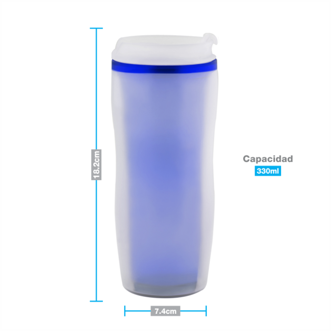 Vaso térmico de plástico de 350 ml. El vaso interno es el que le da el color que se trasluce al vaso exterior con acabado frost. Tapa con cierre de rosca y boquilla con tapa de seguridad. Lavar antes de usar.